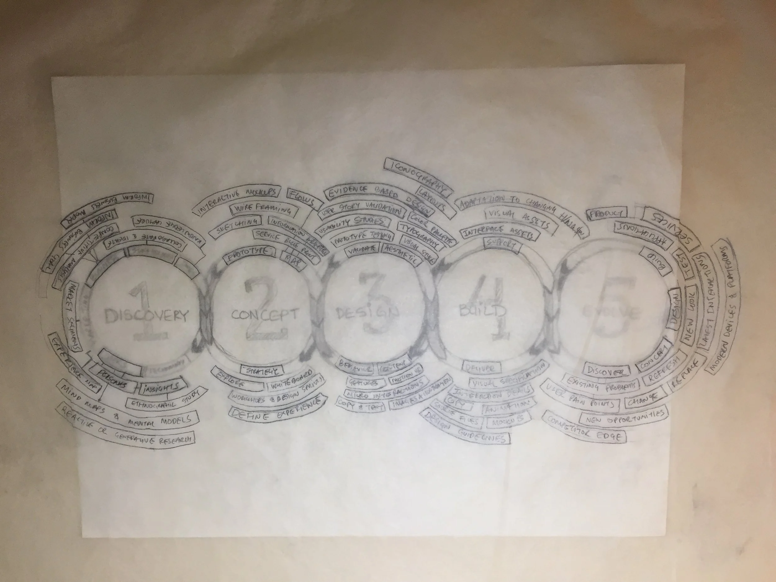 As a leader in our design practice and San Francisco office, I was trying to implement a new business model for the design team. Traditionally Slalom has been great at finding high quality individual contributors for our client needs. Design being a complex process and varying from project to project I wanted to create a tool that can help our account teams, sales team and our design team. This tool served as an education tool, scoping tool and a process tool. I researched several popular design process models; Design thinking from IDEO, Double Diamond from British Design Council, Goal Oriented Design from Cooper, The Elements of User Experience from Jesse James Garrett, Agile methodology, scrum process and a barrage of other process diagrams on design. Identifying what we do and how we do it without having a structure was increasingly becoming a pain point for our design business. We needed a flexible and logical system since we were not a one size (process) fits all design service organization. Addressing synergy with business stakeholders, product and developers was key. Having a range of designers with all levels of experience and specializations the diagram was also intended to web all their strengths in one diagram. This diagram became a single conversation point rather than multiple pages of power point explaining what we do and how we do it to prospect clients.
