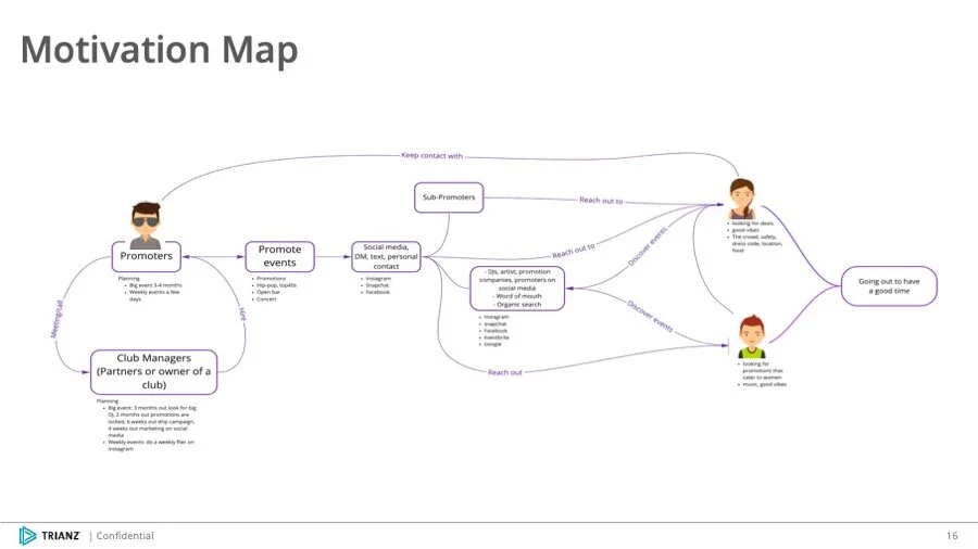 Based on user research we created a set of personas to help create a product that meets user needs while modeled after their behaviors and expectations. These 4 personas shared a relationship with another and had different motivations and expectations from events.