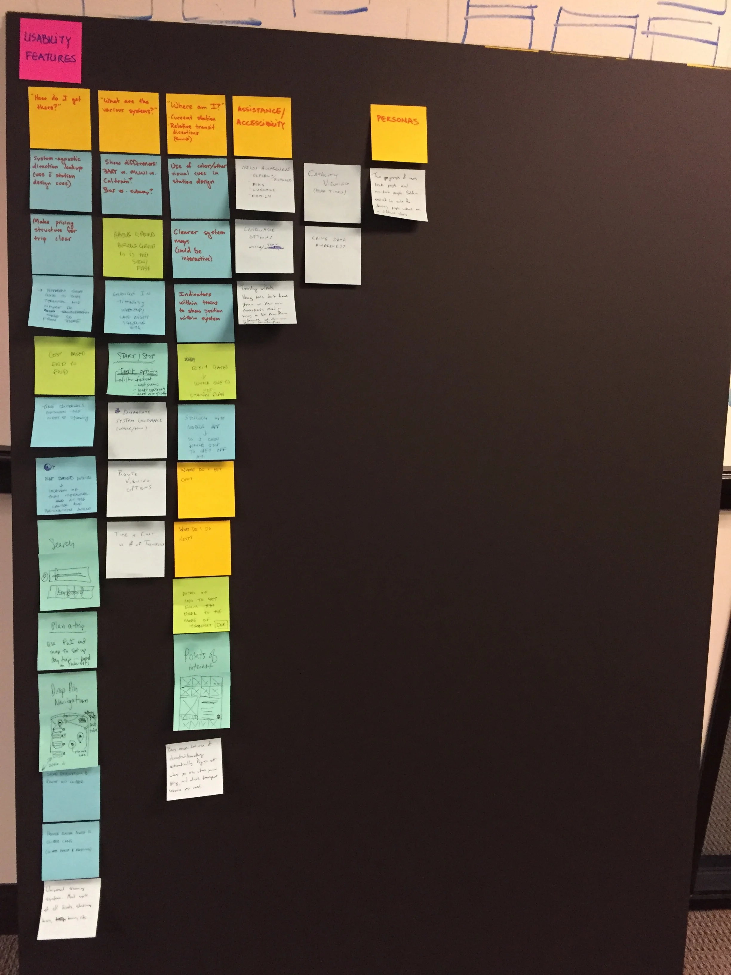 Design team started with a divergent exploration exercise before narrowing down to an idea that excited everyone. After idea selection the design team diverged again to explore different technologies, methods and examples to address design of the kiosk. The team listed all the features, considerations, user types, physical locations, environmental factors and modes of transportation to tackle the complexity of the kiosk. The team decided to leverage transparent display technology to enable a free-standing, approachable from both sides kiosk design.
