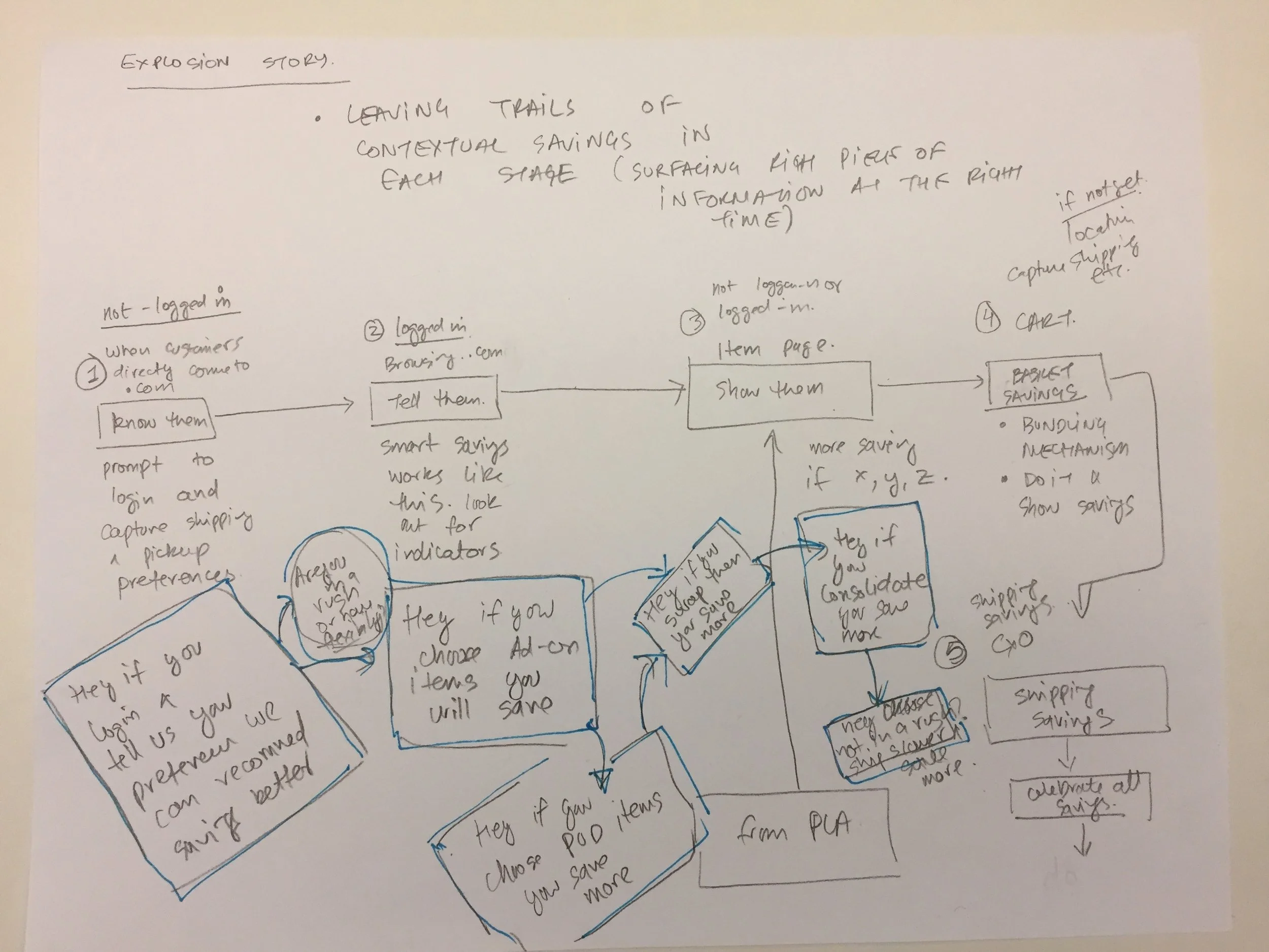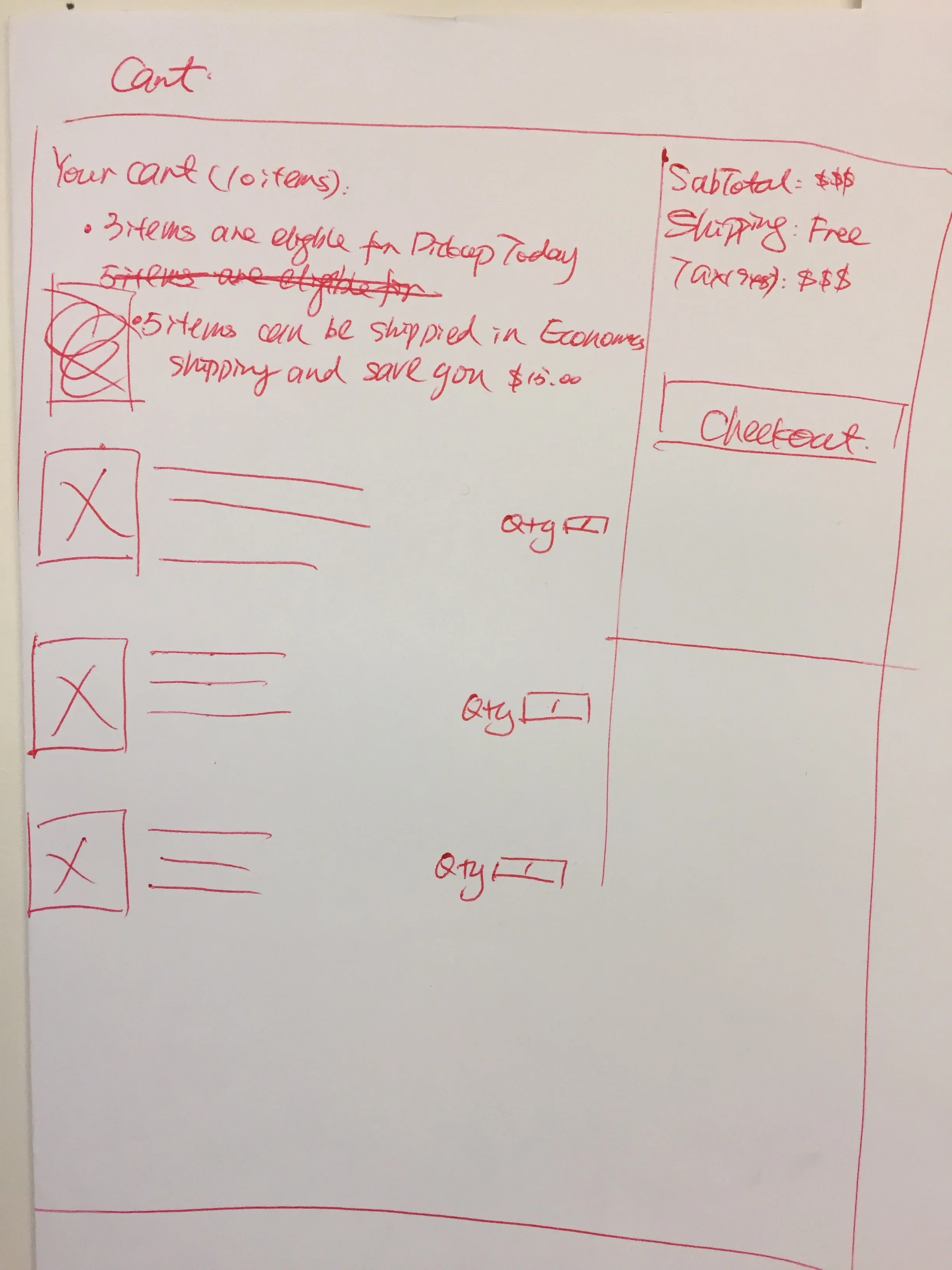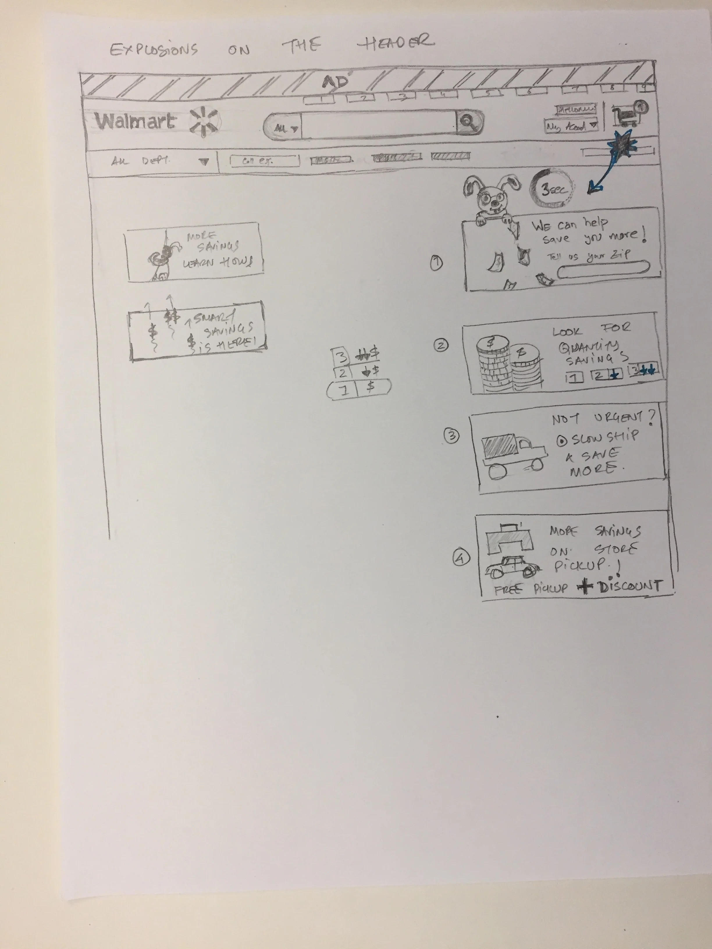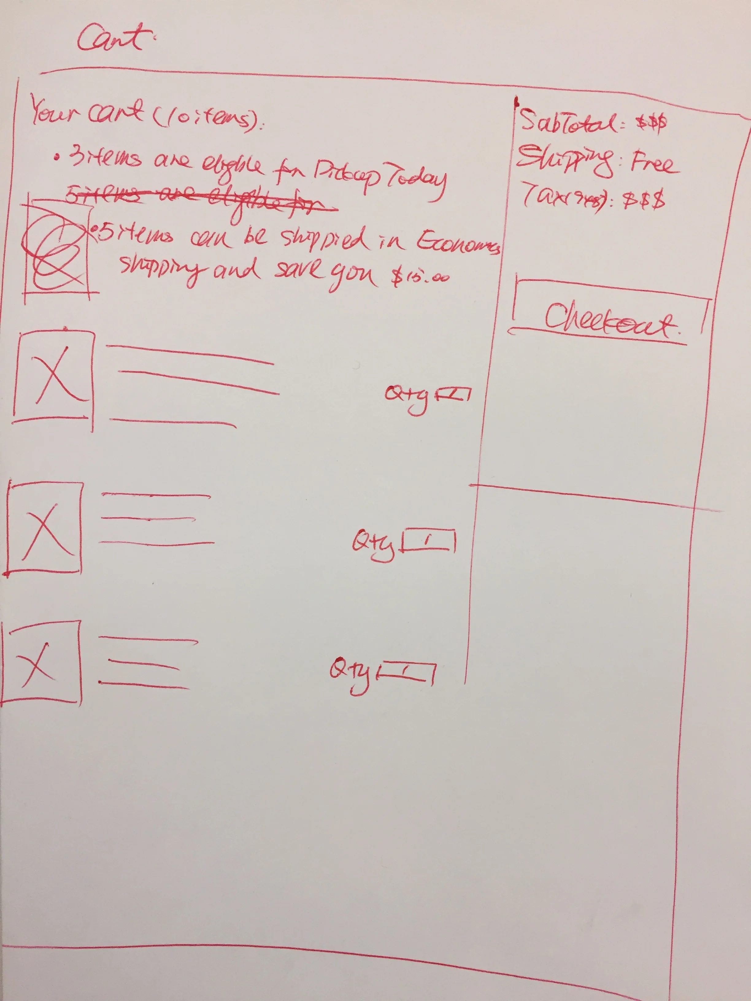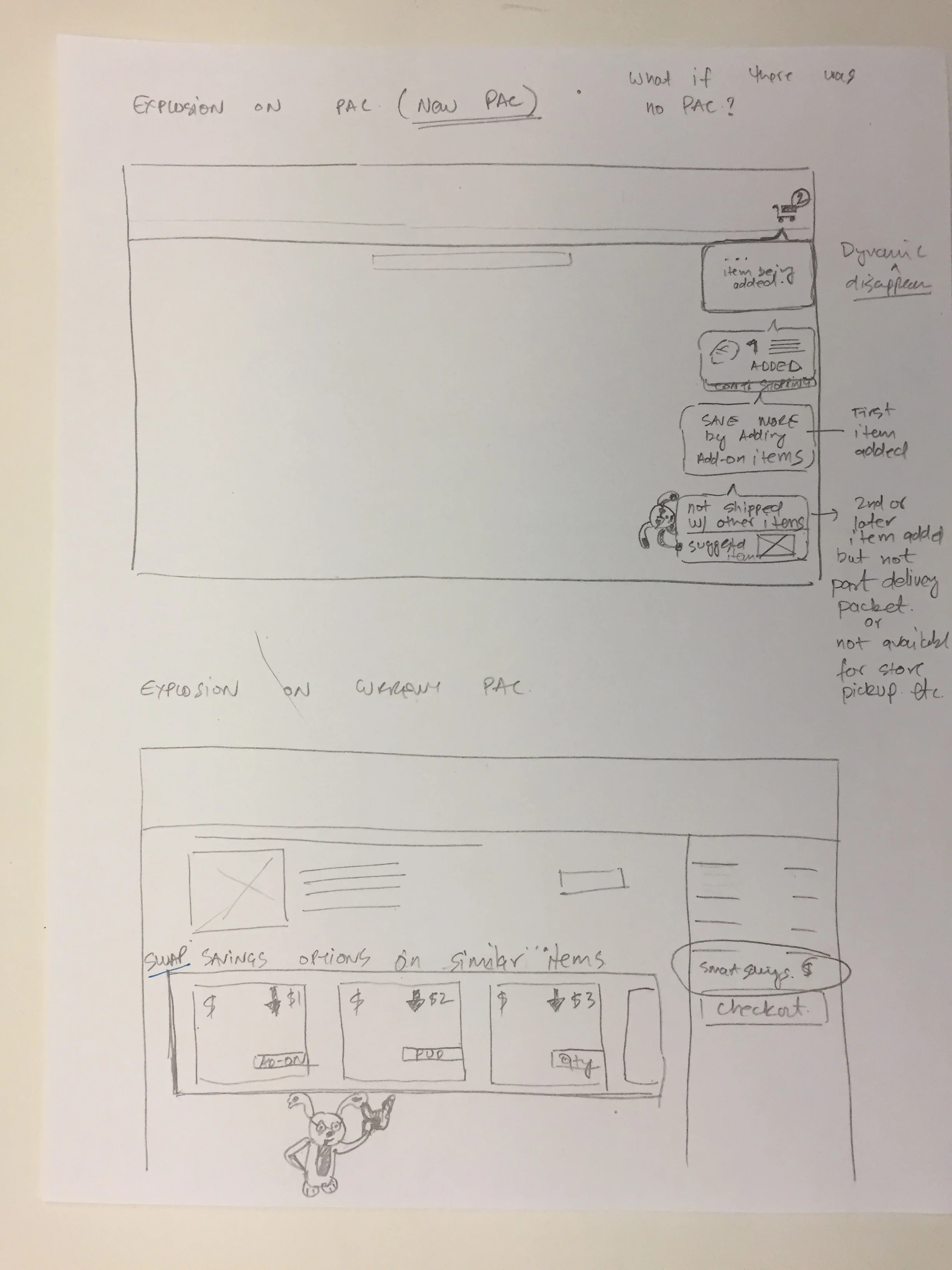 Walmart asked product and design teams to conceptualize and explore new saving mechanism on their digital platforms. C-suite at Walmart.com wanted to inject fresh ideas using Jet.com's dynamic pricing ideas, to help with bulk purchases, fulfillment optimizations and last mile delivery. Walmart historically had been every day low prices (EDLP) but with this new strategy and thinner margins Walmart.com's site experience was identified as the key to give back even more savings back to the customers. Keepings Walmart's personas always in sight and bringing new business ideas a team of designers and product managers were brought together. Customers would be able to even lower their purchase prices depending shipping, bundling and bulk purchases through this program. We put design thinking and agile design sprints in action to ideate, iterate and research some divergent concepts.